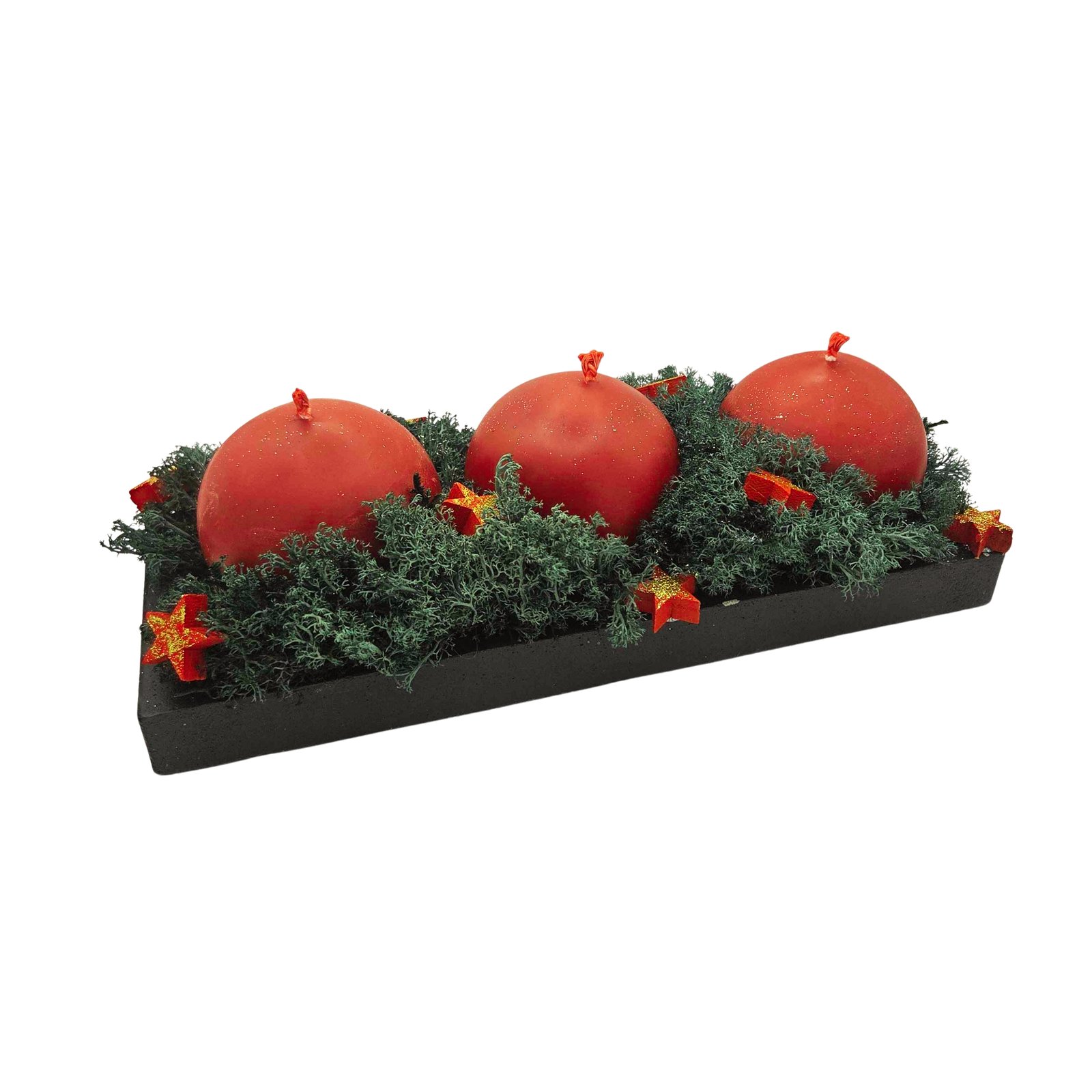 Spalva: Juodas padėkliukas, raudonos natūralaus bičių vaško žvakės, žalios stabilizuotos samanos.